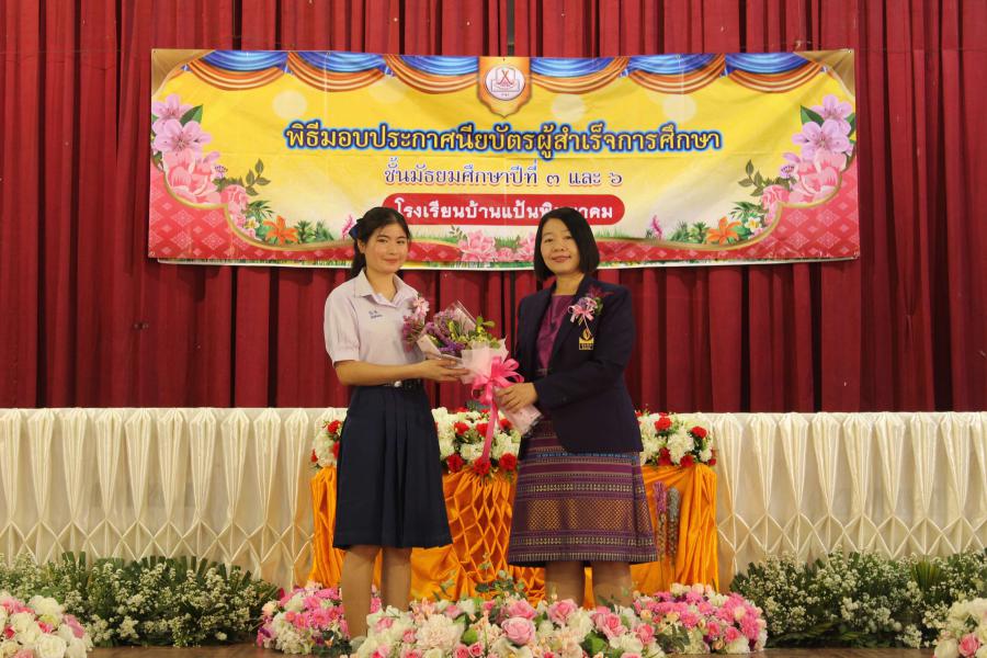 วันที่ 7 มีนาคม 2566 นางกิ่งกาญจน์ โสภาวิบูลรัตน์ ผู้อำนวยการโรงเรียนบ้านแป้นพิทยาคม เป็นประธานในพิธีมอบใบประกาศนียบัตรให้กับนักเรียนชั้นมัธยมศึกษาปีที่ 3 และชั้นมัธยมศึกษาปีที่ 6 ที่สำเร็จการศึกษาประจำปีการศึกษา 2565 การจัดกิจกรรมในครั้งนี้มีวัตถุประสงค์เพื่อให้นักเรียนเกิดความภาคภูมิใจที่สำเร็จการศึกษา และในปีการศึกษานี้ มีนักเรียนที่สำเร็จการศึกษาจำนวน 98 คน นอกจากนี้นางกิ่งกาญจน์ โสภาวิบูลรัตน์ ยังได้มอบเกียรติบัตรให้กับนักเรียนที่มีผลการเรียนดี ตลอด 5 เทอม และมอบช่อดอกไม้แสดงความยินดีให้กับนักเรียนชั้นมัธยมศึกษาปีที่ 6 ที่สามารถเข้าศึกษาต่อในระดับที่สูงขึ้นของสถาบันต่าง ๆ โดยมีผู้บริหาร คณะครูและบุคลากรทางการศึกษาของโรงเรียน บ้านแป้นพิทยาคมเข้าร่วมกิจกรรม ณ หอประชุมโรงเรียนบ้านแป้นพิทยาคม S:0