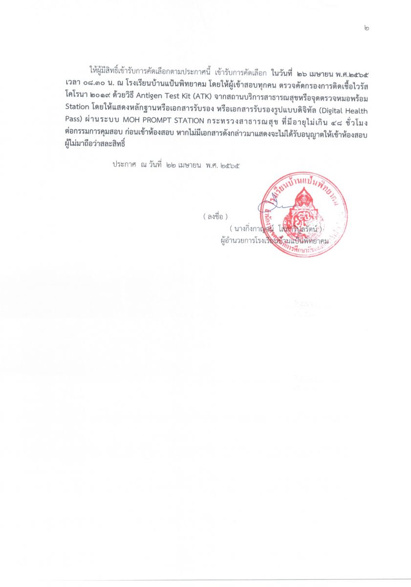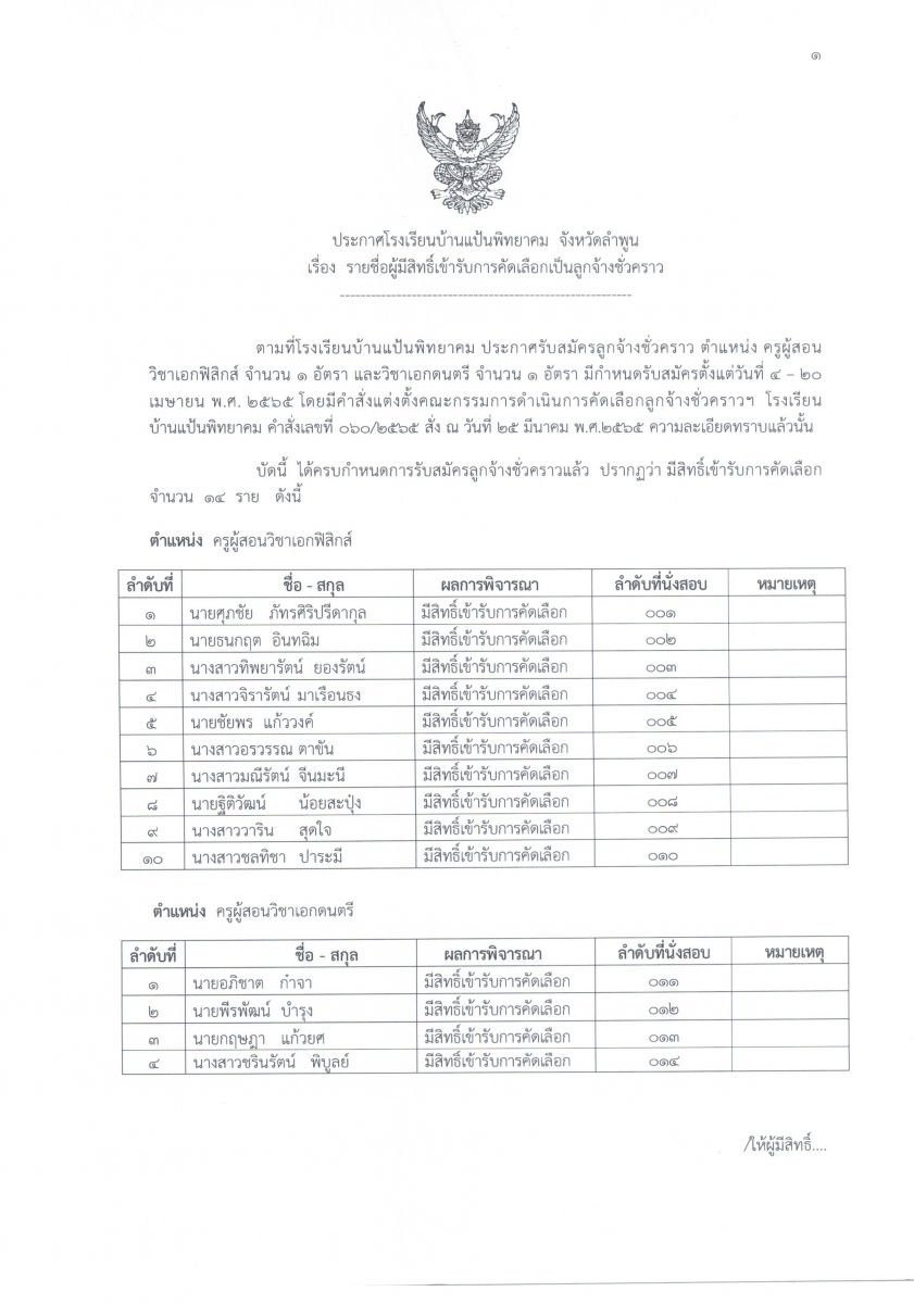 ประกาศโรงเรียนบ้านแป้นพิทยาคม เรื่อง รายชื่อผู้มีสิทธิ์เข้ารับการคัดเลือกเป็นลูกจ้างชั่วคราว ตำแหน่ง ครูผู้สอนวิชาเอกฟิสิกส์ และ ครูผู้สอนวิชาเอกดนตรี