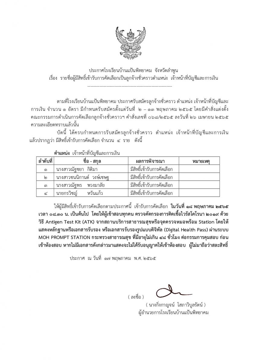 ประกาศโรงเรียนบ้านแป้นพิทยาคม เรื่อง รายชื่อผู้มีสิทธิ์เข้ารับการคัดเลือกเป็นลูกจ้างชั่วคราว ตำแหน่ง เจ้าหน้าที่บัญชีและการเงิน