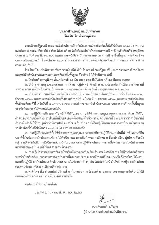 ประกาศโรงเรียนบ้านแป้นพิทยาคม เรื่องการปิดเรียนด้วยเหตุพิเศษ