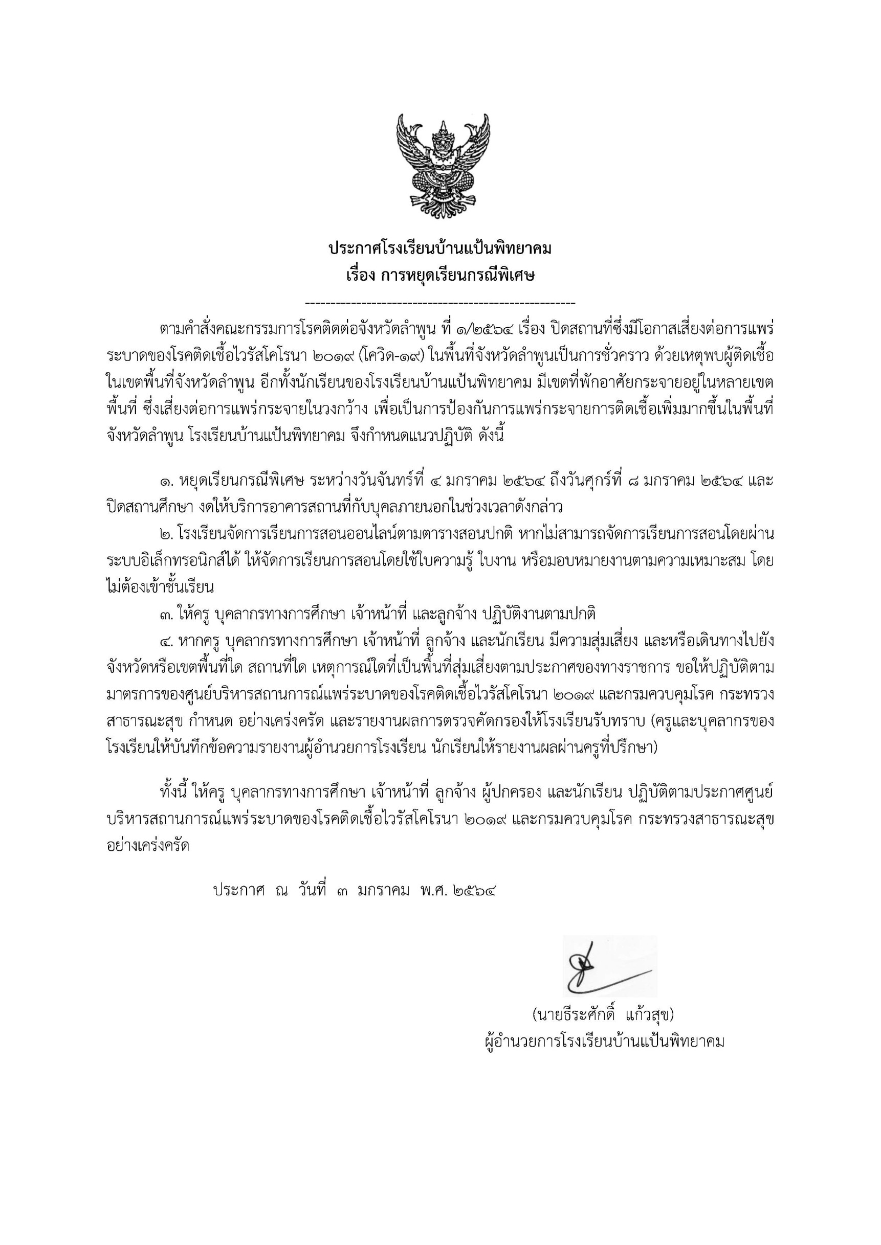 แจ้งประกาศ เรื่อง การปิดเรียนกรณีมีเหตุพิเศษ 4 - 8 มกราคม 2564