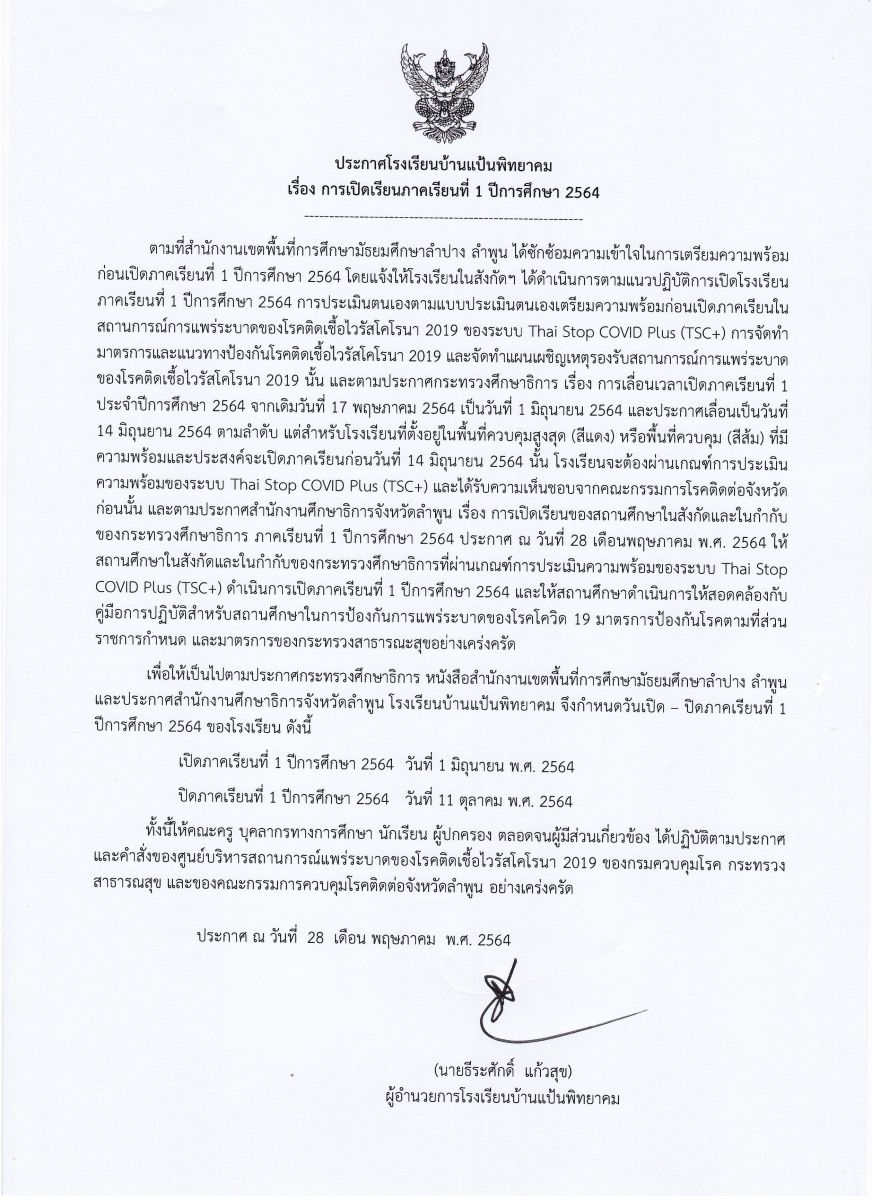 แจ้ง กำหนดการเปิดเรียน ภาคเรียนที่ 1 ปีการศึกษา 2564
