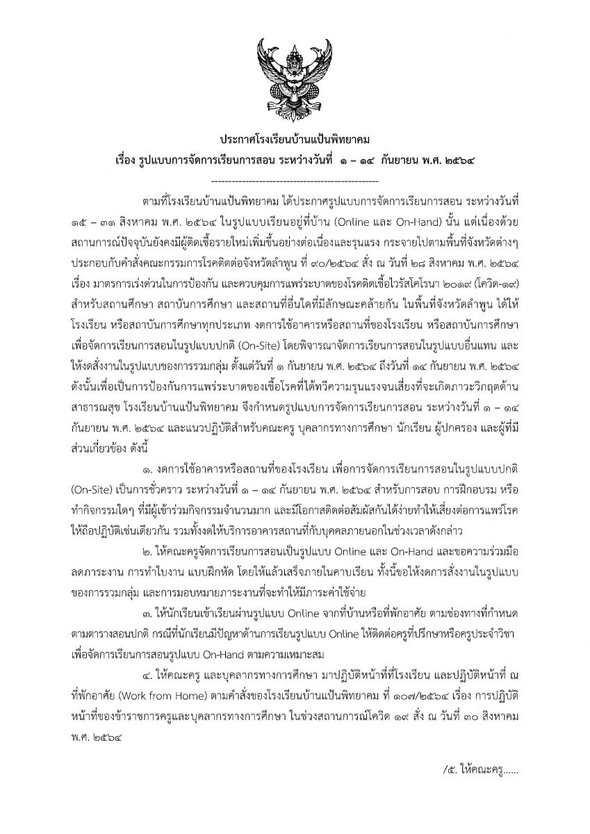เรื่อง รูปแบบการจัดการเรียนการสอน ระหว่าง 1 - 14 กันยายน 2564