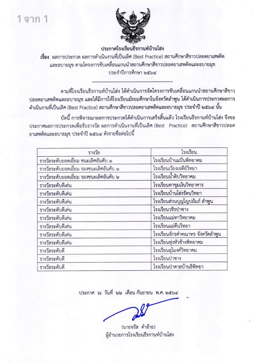ขอแสดงความยินดีกับโรงเรียนบ้านแป้นพิทยาคม กับ รางวัลระดับยอดเยี่ยม ชนะเลิศอันดับ 1 (Best Practice) สถานศึกษาสีขาวปลอดยาเสพติดและอบายมุข ประจำปีการศึกษา 2564 จังหวัดลำพูน