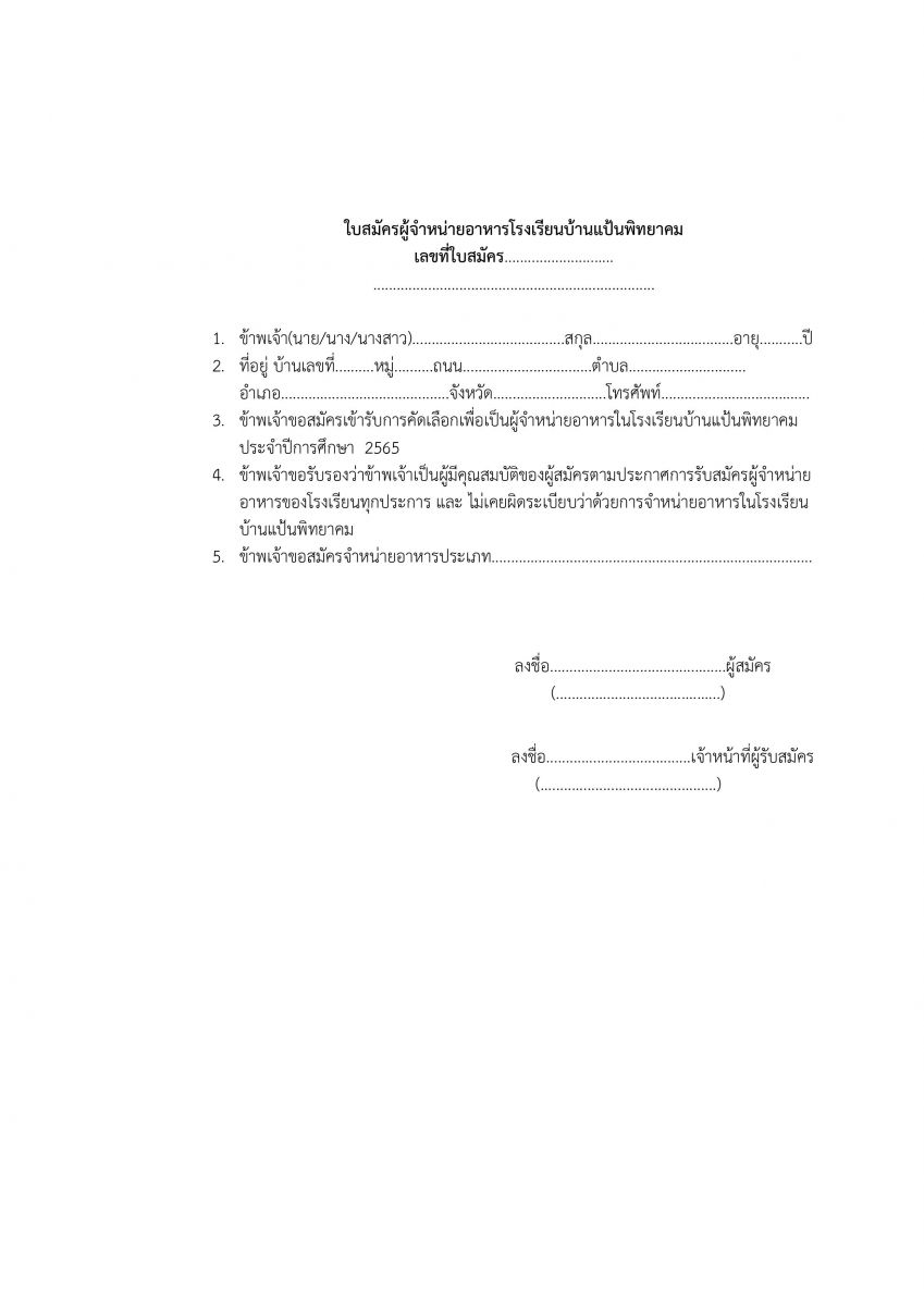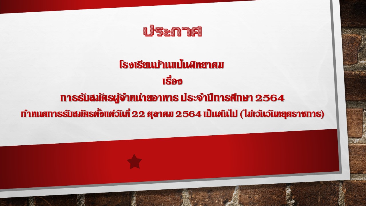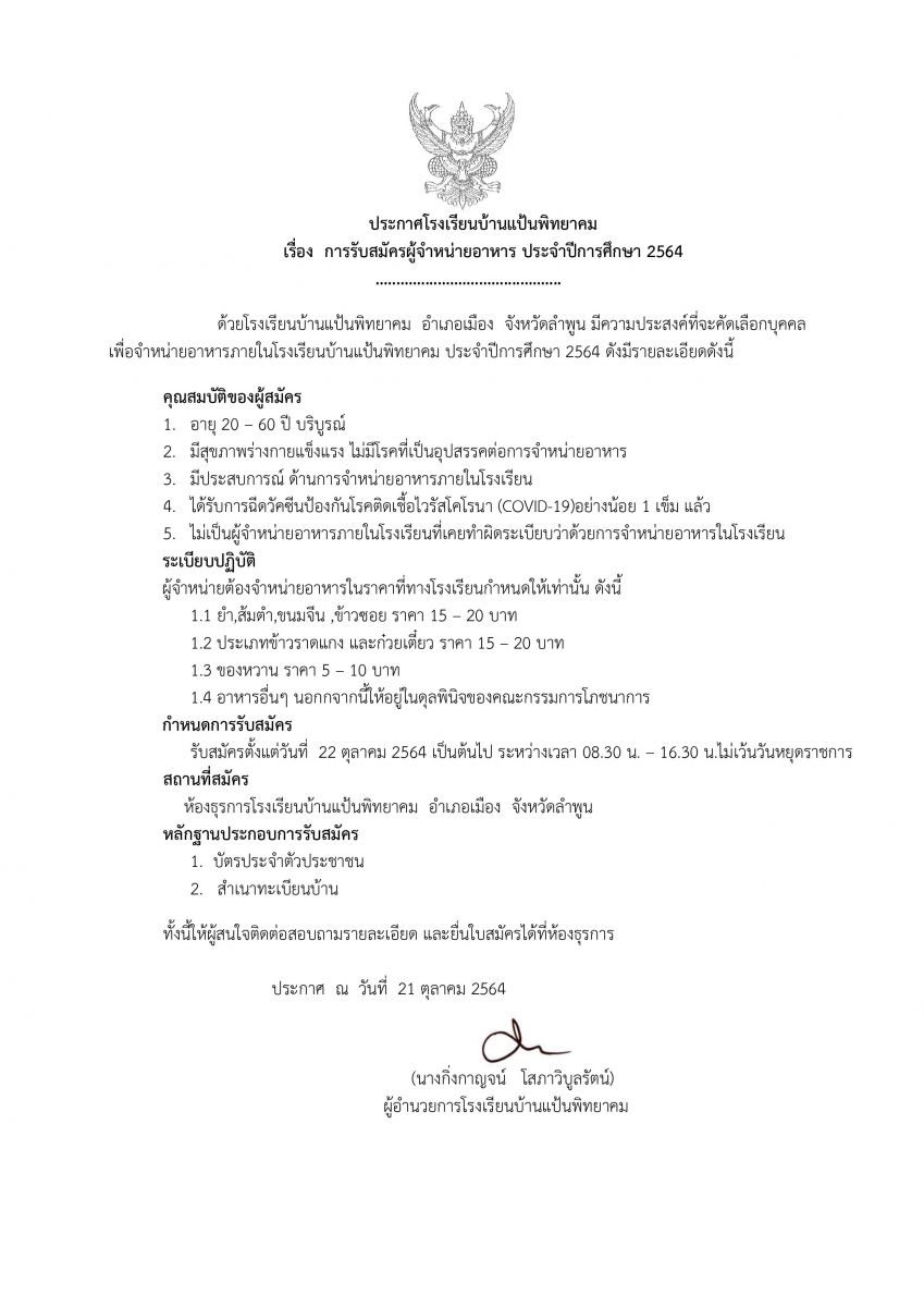 ประกาศโรงเรียนบ้านแป้นพิทยาคม เรื่อง การรับสมัครผู้จำหน่ายอาหาร ประจำปีการศึกษา 2564 กำหนดการรับสมัครตั้งแต่วันที่ 22 ตุลาคม 2564 เป็นต้นไป (ไม่เว้นวันหยุดราชการ)