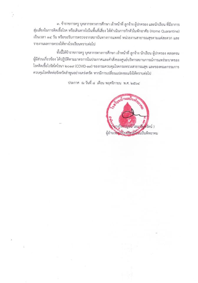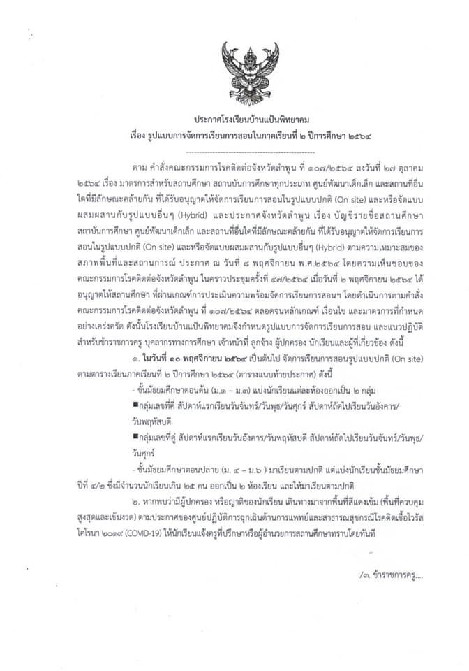 ประกาศ รูปแบบการจัดการเรียนการสอน ตั้งแต่วันที่ 10 พฤศจิกายน 2564 เป็นต้นไป
