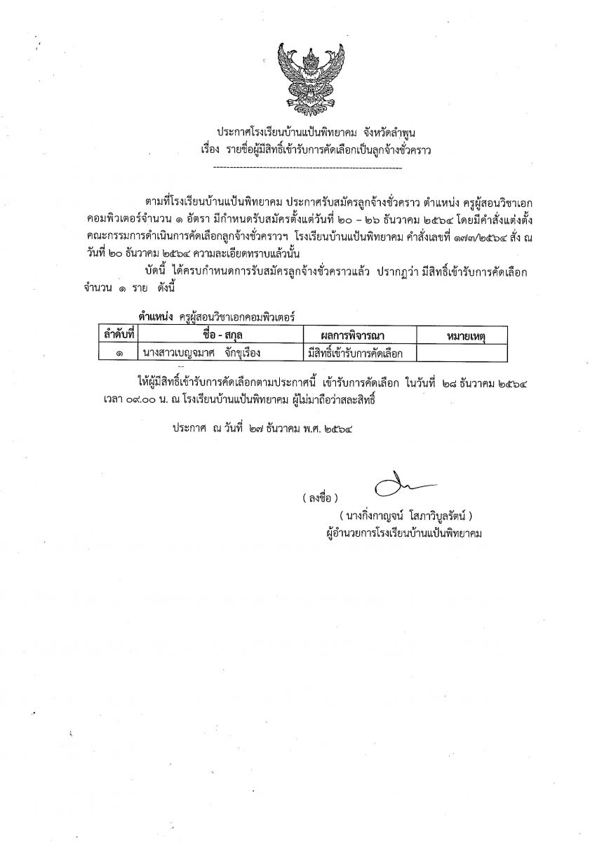 ประกาศโรงเรียนบ้านแป้นพิทยาคม เรื่่อง รายชื่อ ผู้มีสิทธิ์เข้ารับการคัดเลือกเป็นลูกจ้างชั่วคราว ตำแหน่งครูผู้สอนคอมพิวเตอร์