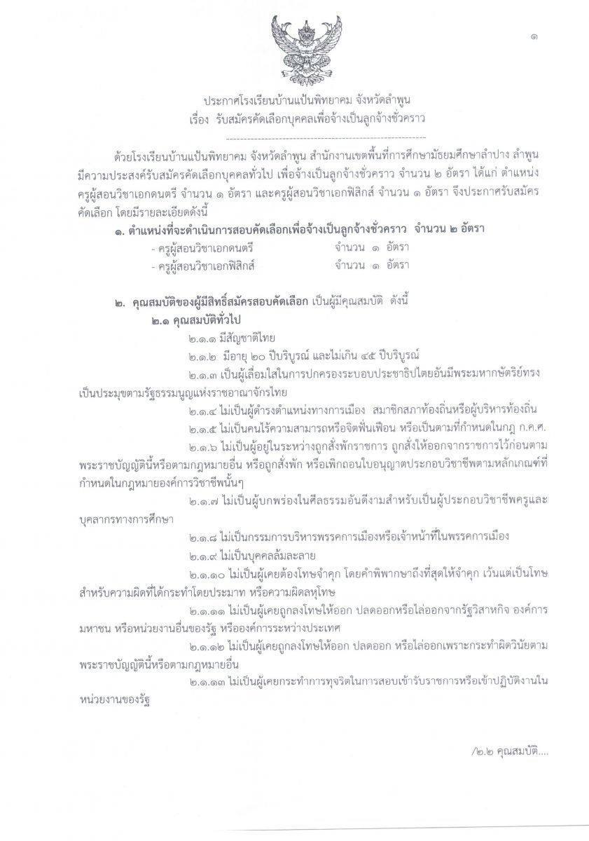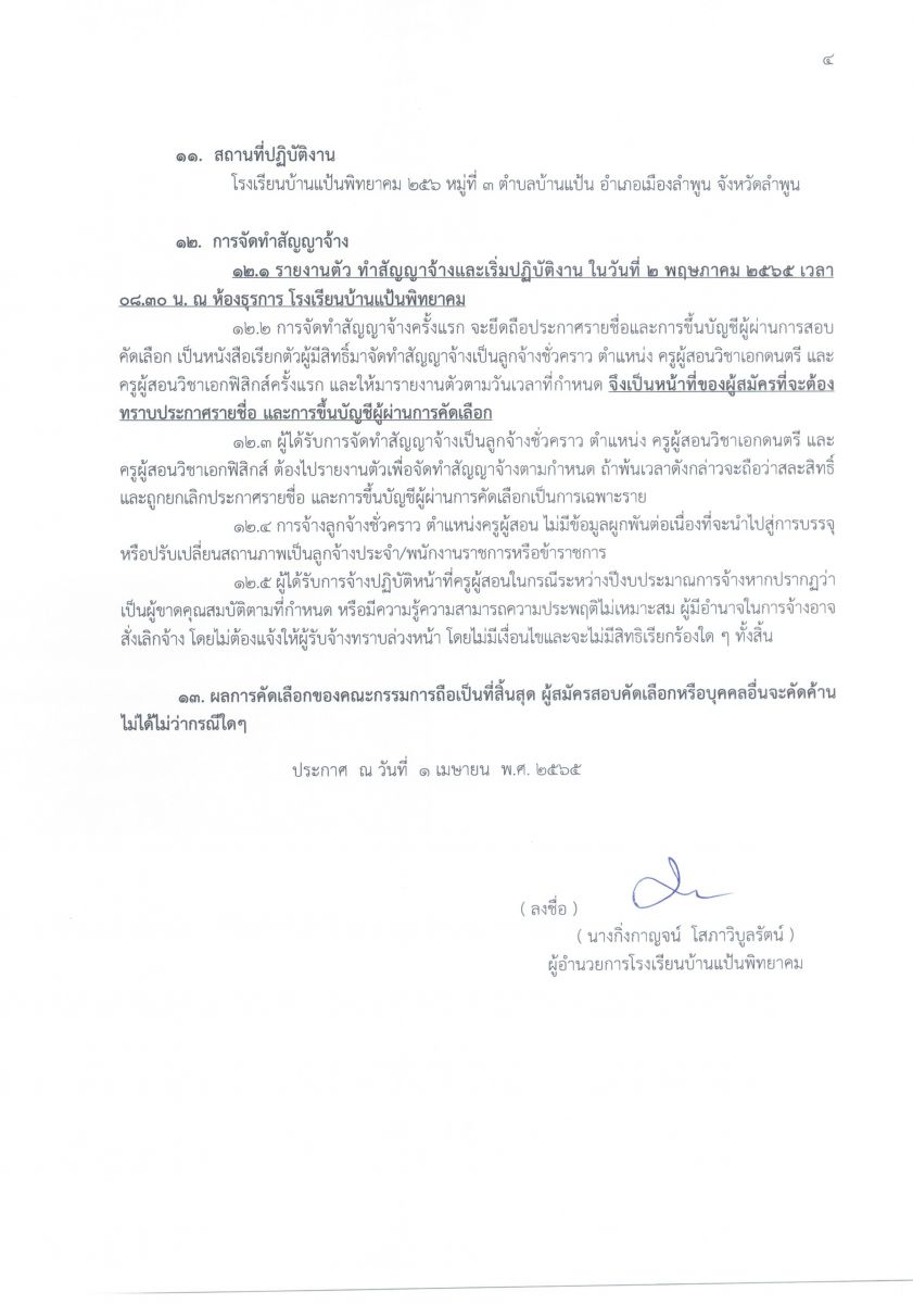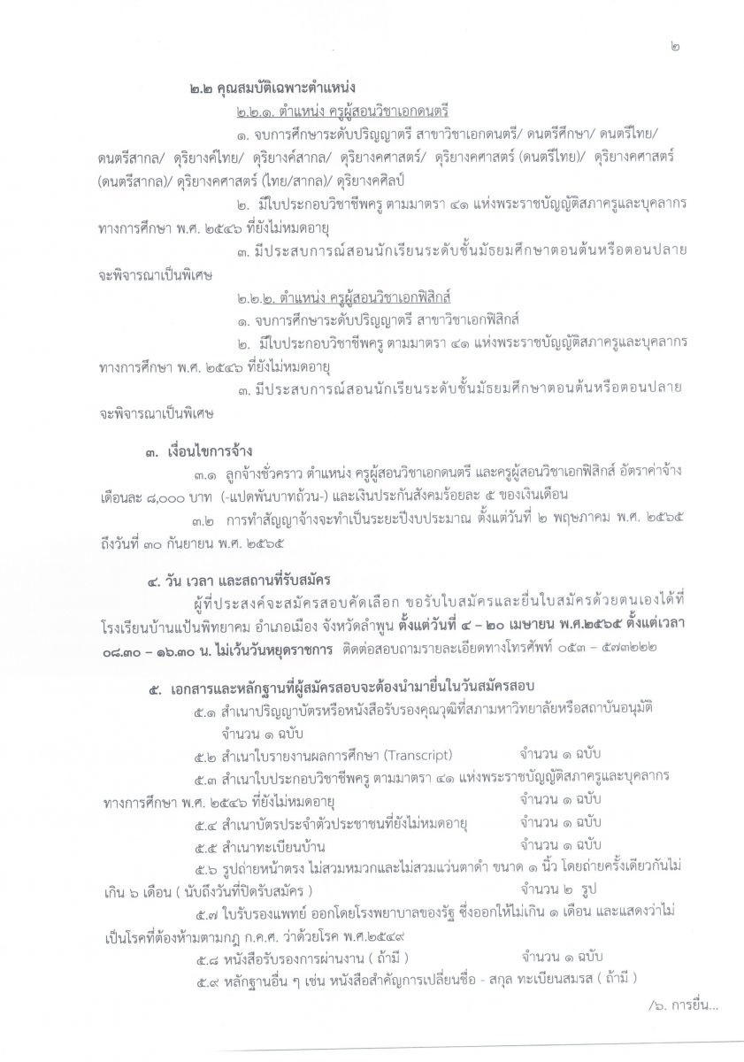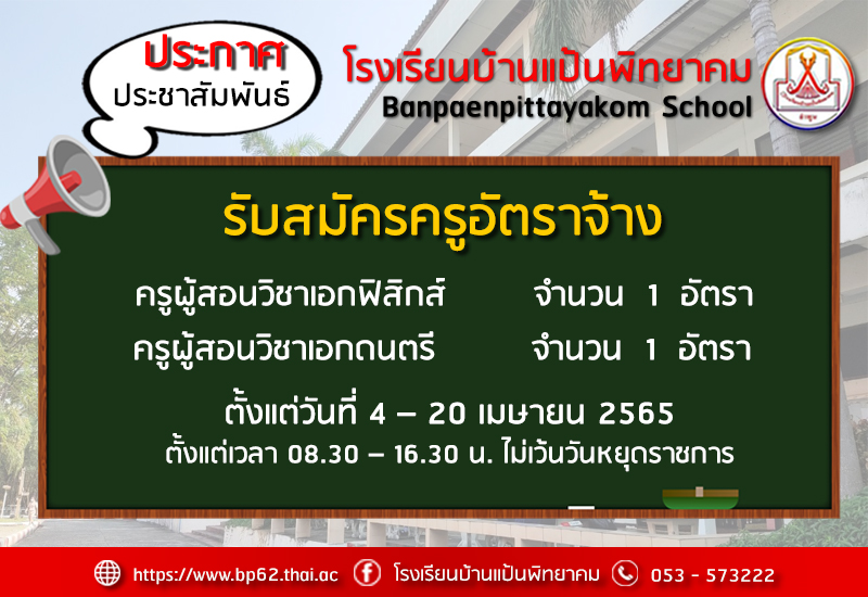 ประกาศโรงเรียนบ้านแป้นพิทยาคม เรื่อง รับสมัครลูกจ้างชั่วคราว ตำแหน่ง ครูผู้สอน วิชาเอกฟิสิกส์ และ ครูผู้สอน วิชาเอกดนตรี ระหว่างวันที่ 4-20 เมษายน 2565 (ไม่เว้นวันหยุดราชการ)