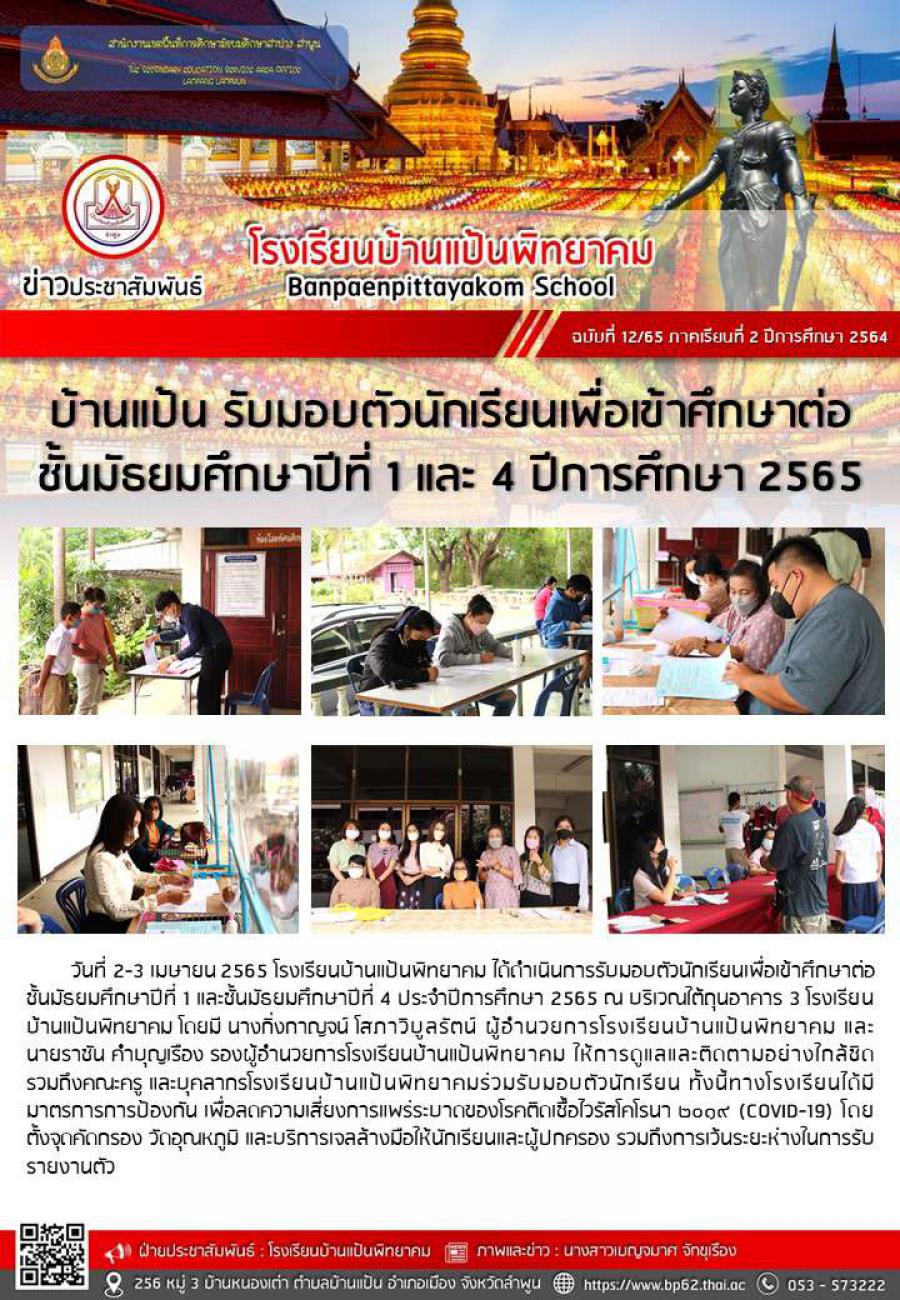 บ้านแป้น รับมอบตัวนักเรียนเพื่อเข้าศึกษาต่อ ชั้นมัธยมศึกษาปีที่ 1 และ 4 ปีการศึกษา 2565