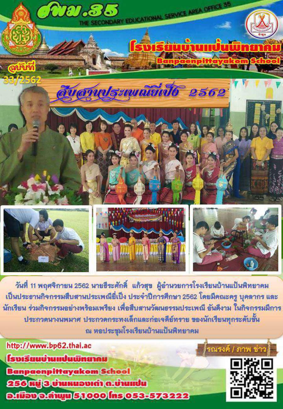 วันที่ 11 พฤศจิกายน 2562 นายธีระศักดิ์ แก้วสุข ผู้อำนวยการโรงเรียนบ้านแป้นพิทยาคม เป็นประธานกิจกรรมสืบสานประเพณียี่เป็ง ประจำปีการศึกษา 2562 โดยมีคณะครู บุคลากร และนักเรียน ร่วมกิจกรรมอย่างพร้อมเพรียง เพื่อสืบสานวัฒนธรรมประเพณี อันดีงาม ในกิจกรรมมีการประกวดนางนพมาศ ประกวดกระทงเล็กและก่อเจดีย์ทราย ของนักเรียนทุกระดับชั้น ณ หอประชุมโรงเรียนบ้านแป้นพิทยาคม