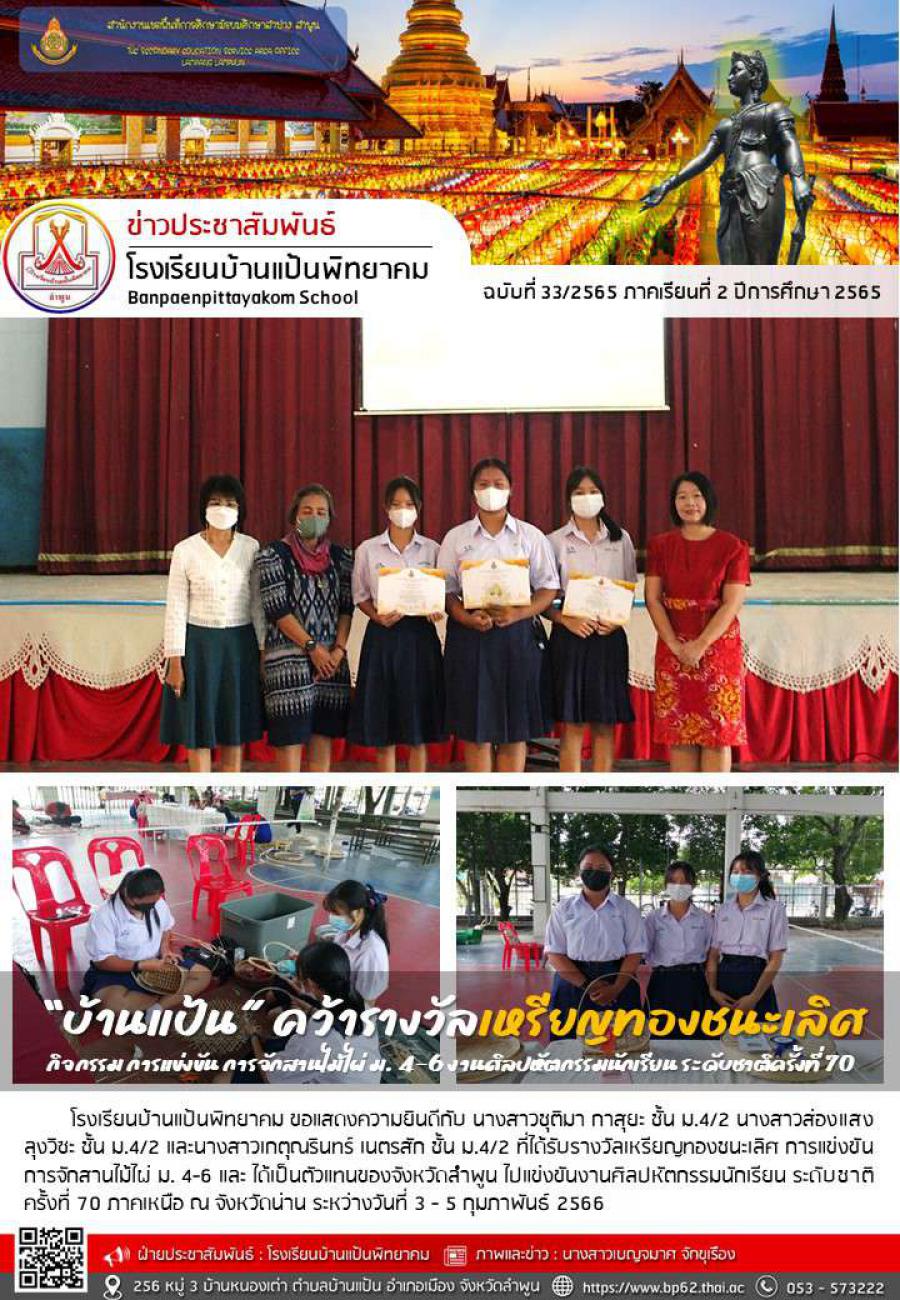 "บ้านแป้น" คว้ารางวัลเหรียญทองชนะเลิศ กิจกรรม การแข่งขัน การจักสานไม้ไผ่ ม. 4-6 งานศิลปหัตกรรมนักเรียน ระดับชาติครั้งที่ 70
