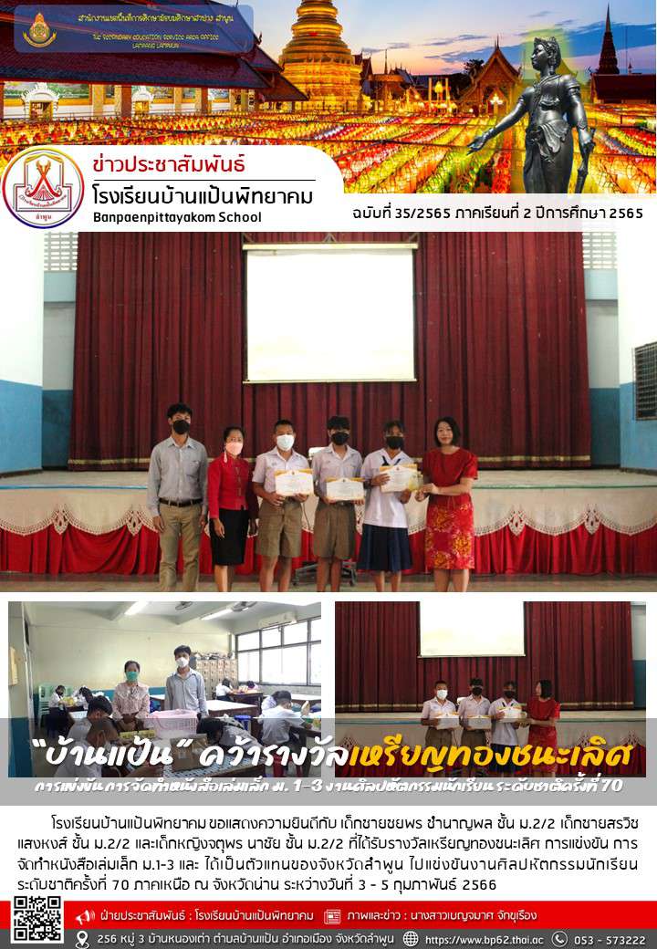 "บ้านแป้น" คว้ารางวัลเหรียญทองชนะเลิศ การแข่งขัน การจัดทำหนังสือเล่มเล็ก ม. 1-3 งานศิลปหัตกรรมนักเรียน ระดับชาติครั้งที่ 70
